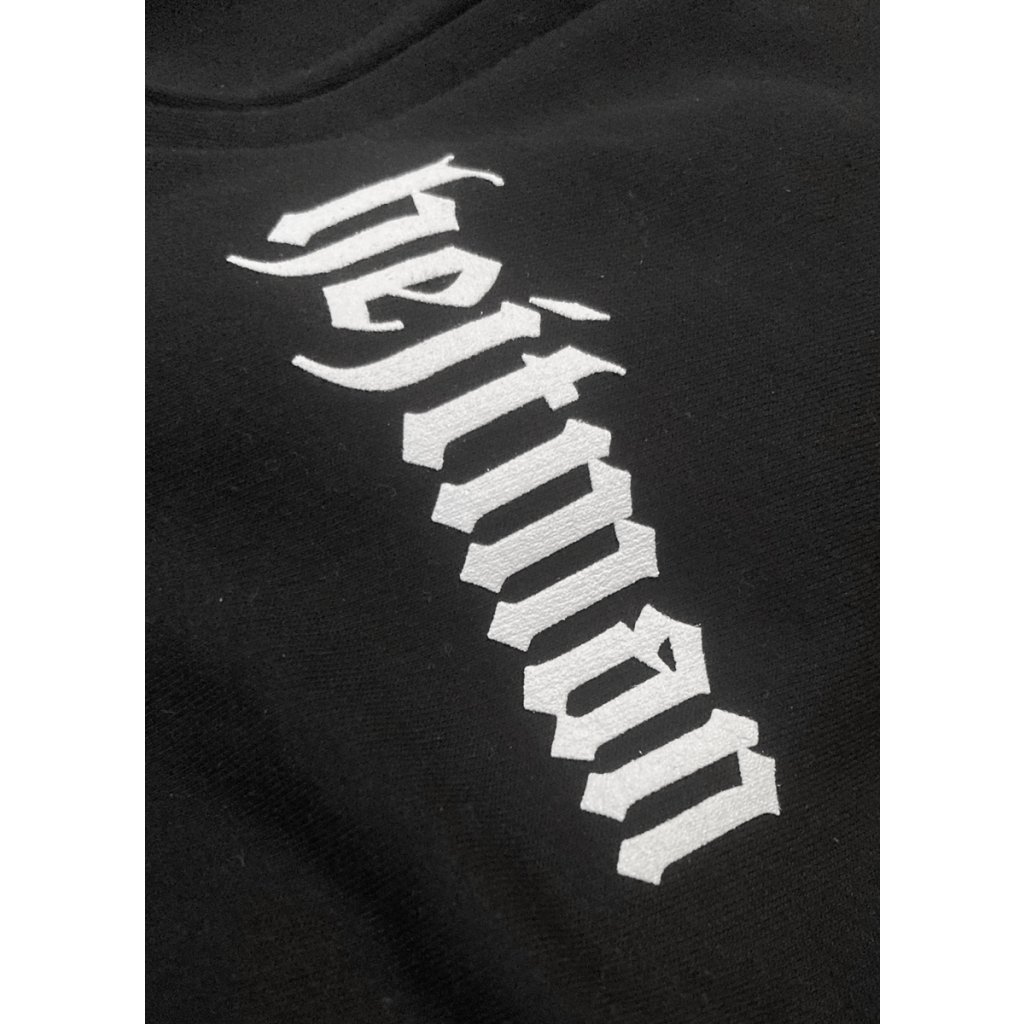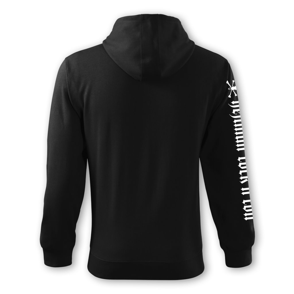 Černá zapínací mikina s kapucí a bílým potiskem.
